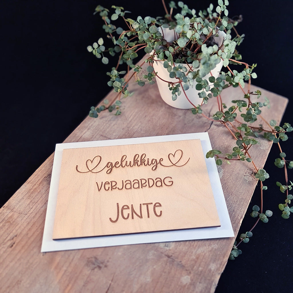 Originele houten verjaardagskaart waar je één of meerdere namen kan bijzetten.