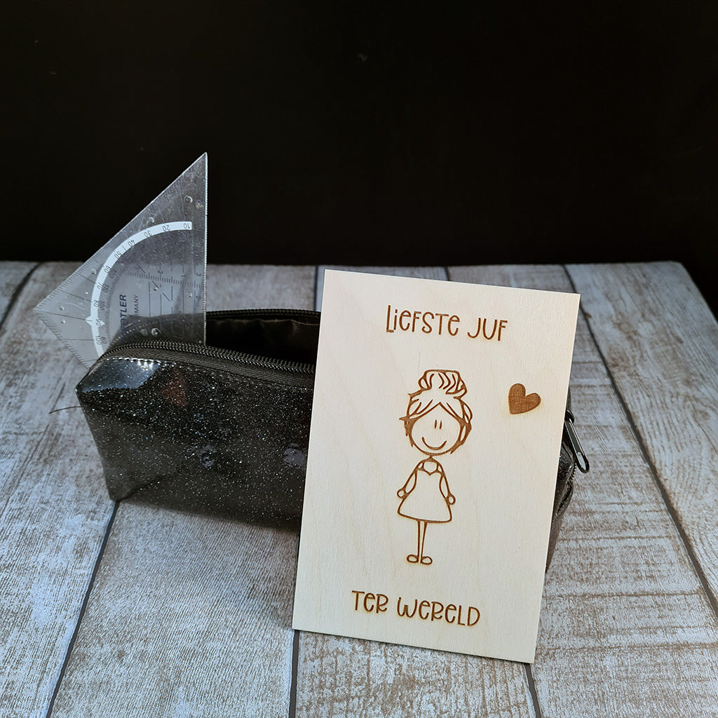 Originele houten wenskaart om je juf te laten weten dat ze de liefste is.