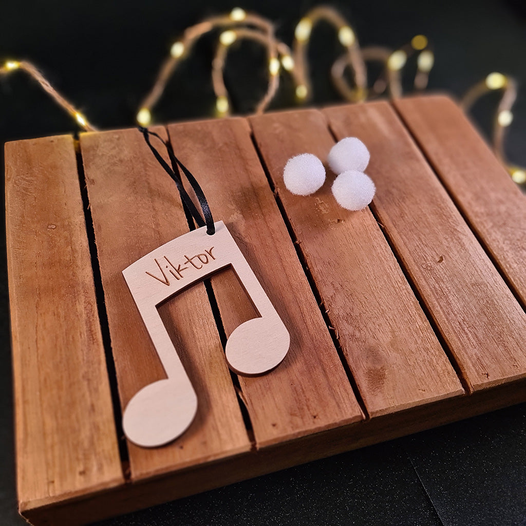 Unieke kerstversiering in de vorm van een muzieknoot, met een zelfgekozen naam. Per stuk verkrijgbaar.
