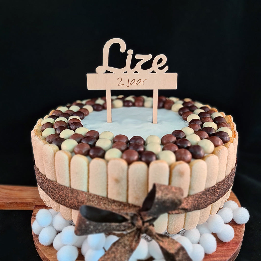 Een feestelijk detail dat je taart een persoonlijk tintje geeft — met naam en leeftijd gegraveerd in warm hout. Puur, vrolijk en uniek voor elk feestje.
