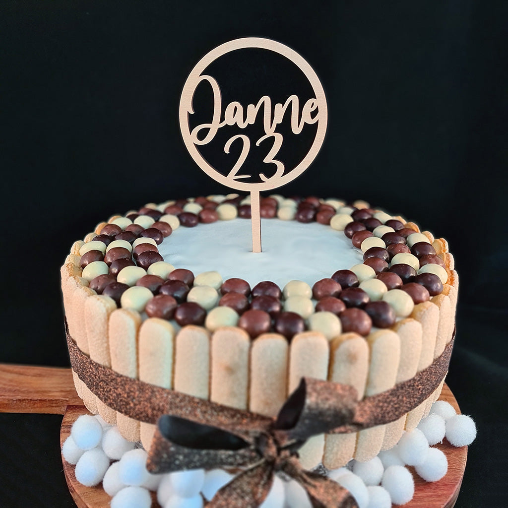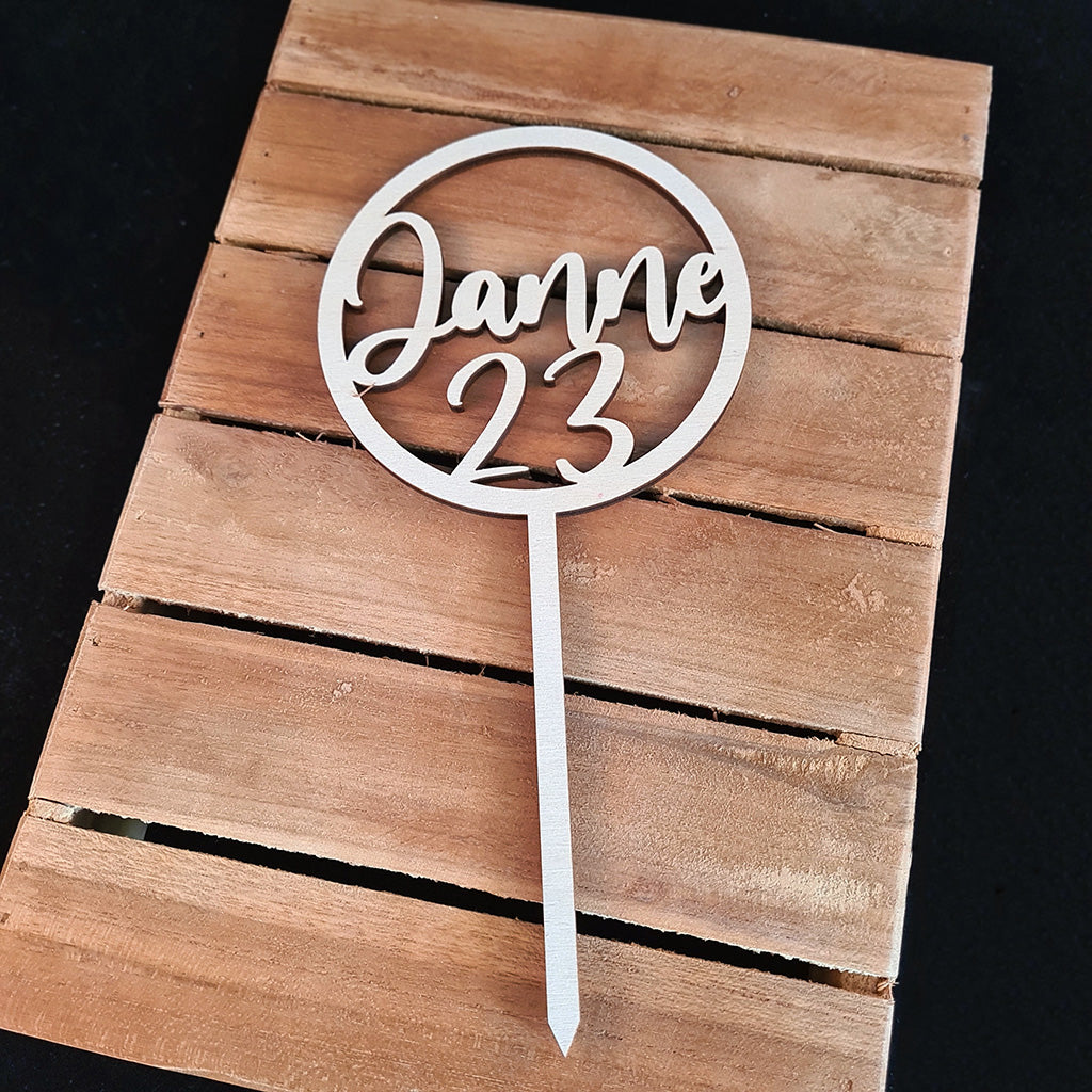 Een elegante cirkel vol feestvreugde — met naam en leeftijd sierlijk uitgesneden in hout. Een persoonlijk detail dat elke taart laat stralen.