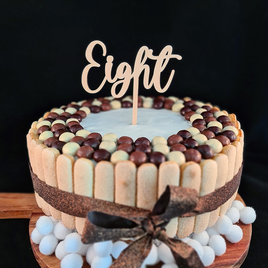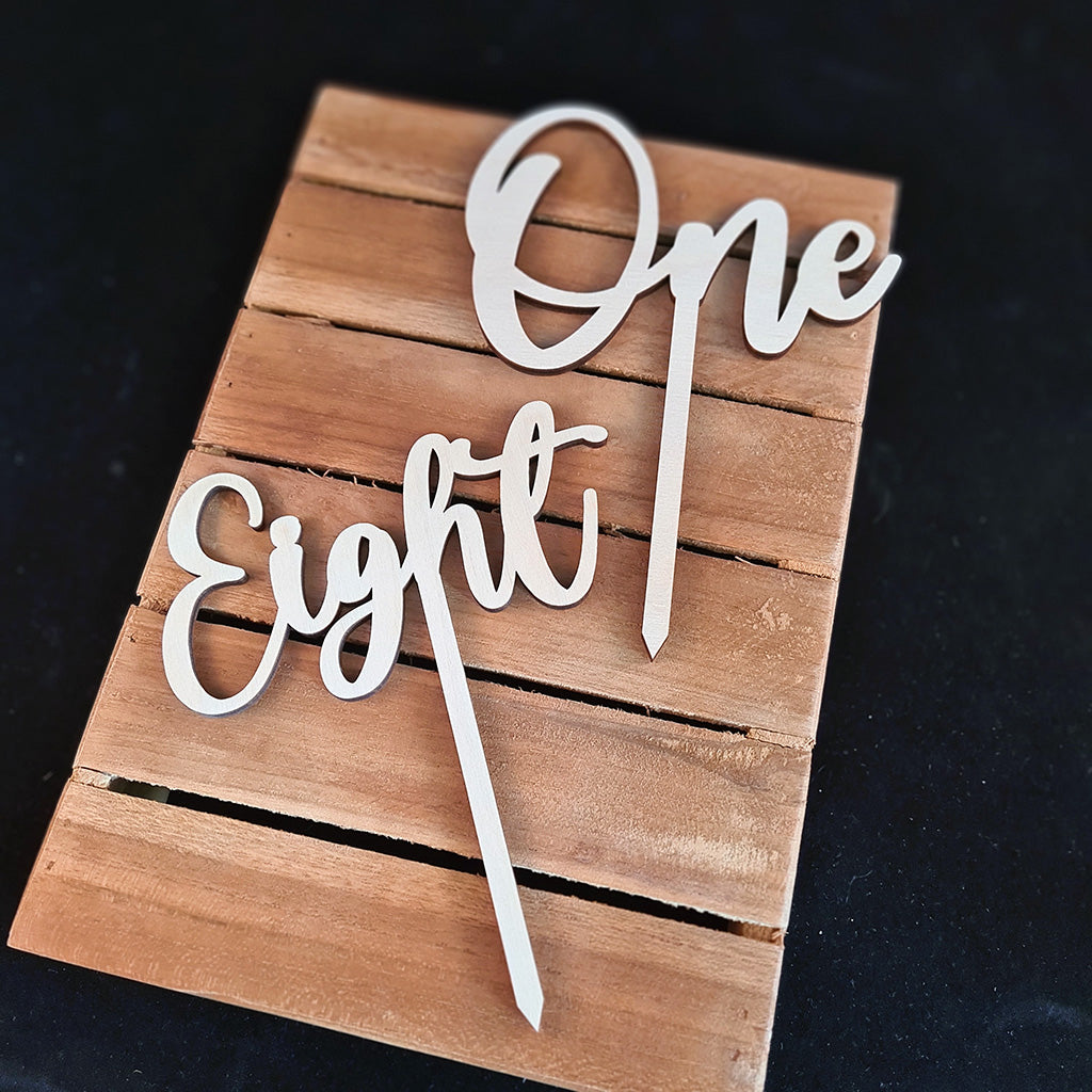 Een sierlijke houten taarttopper met geschreven cijfers — elegant, tijdloos en perfect om elke leeftijd met stijl te vieren.
