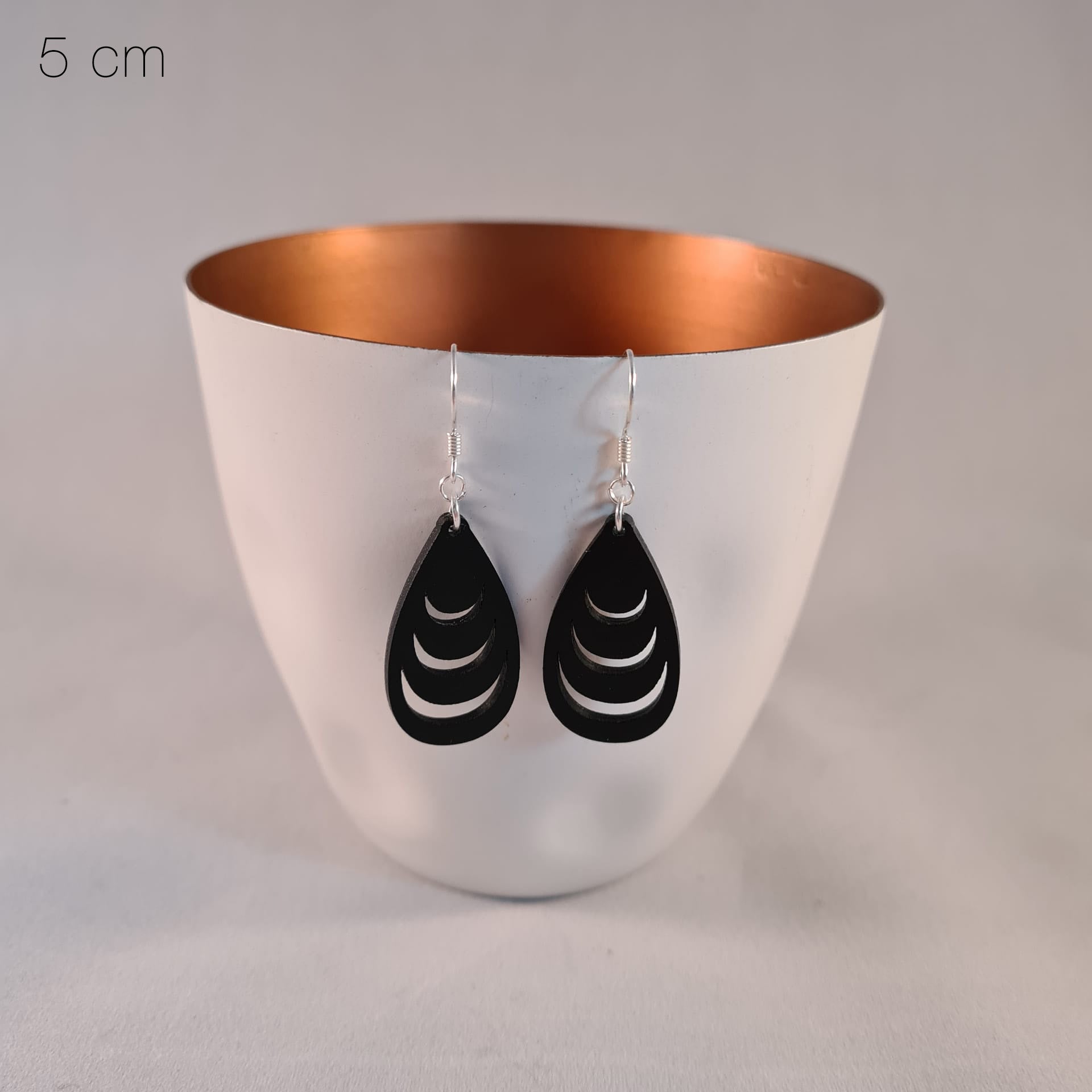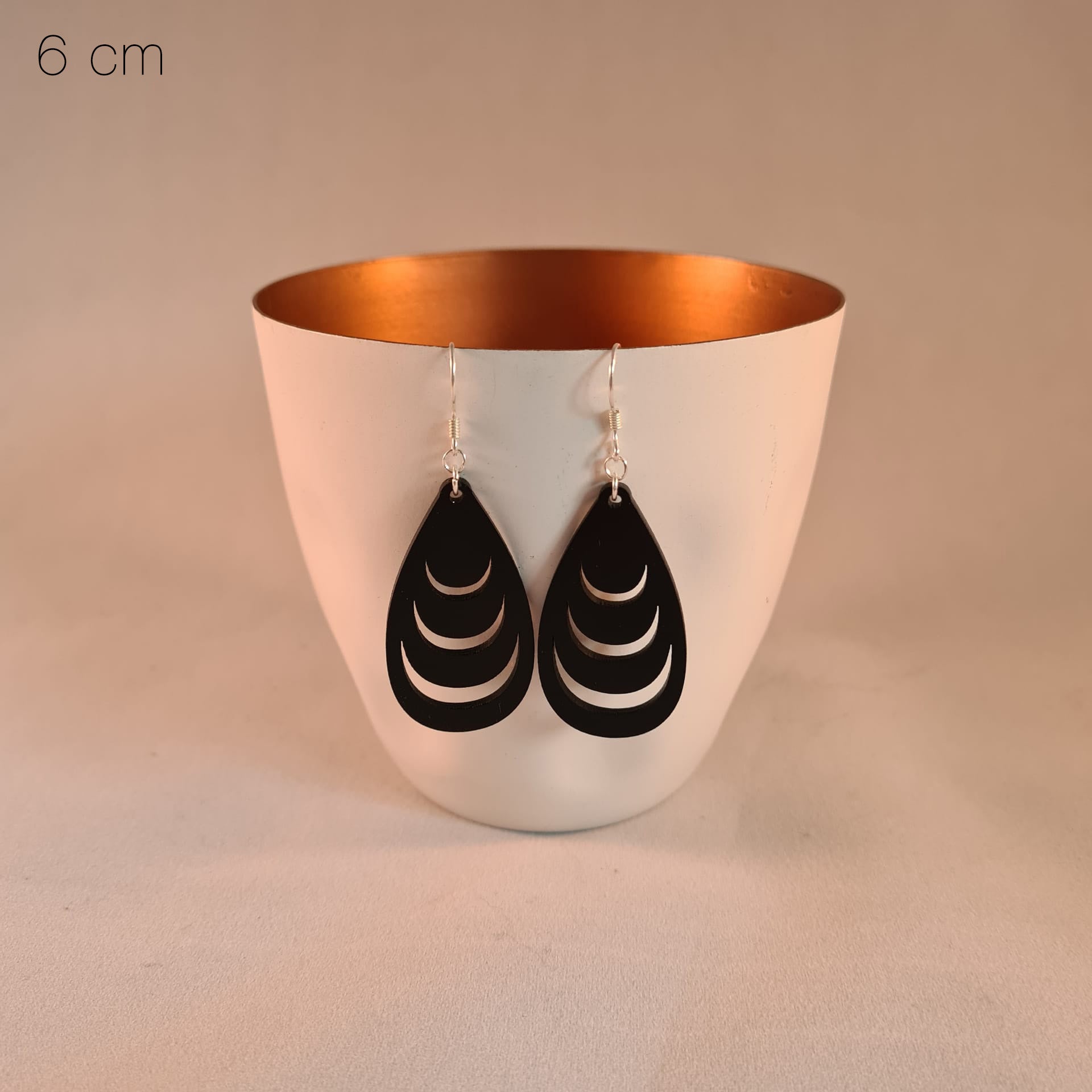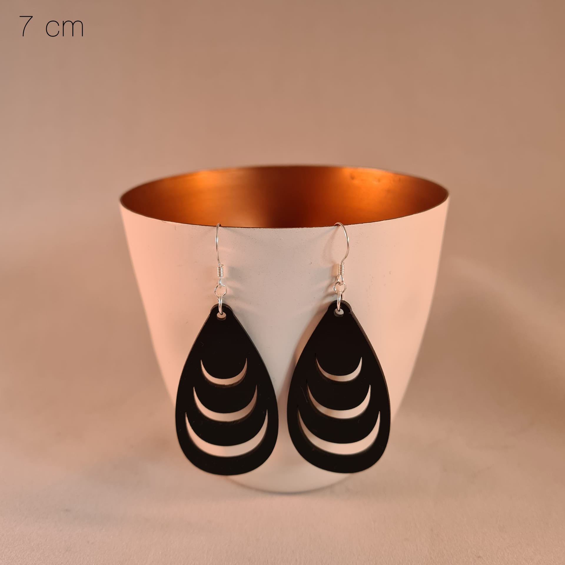 Deze zwarte oorbellen combineren de zachtheid van de druppelvorm met een uitgesproken gelaagd patroon. De brede, vloeiende lijnen creëren diepte en ritme, terwijl de diepe zwarte kleur zorgt voor een stijlvolle, moderne uitstraling.