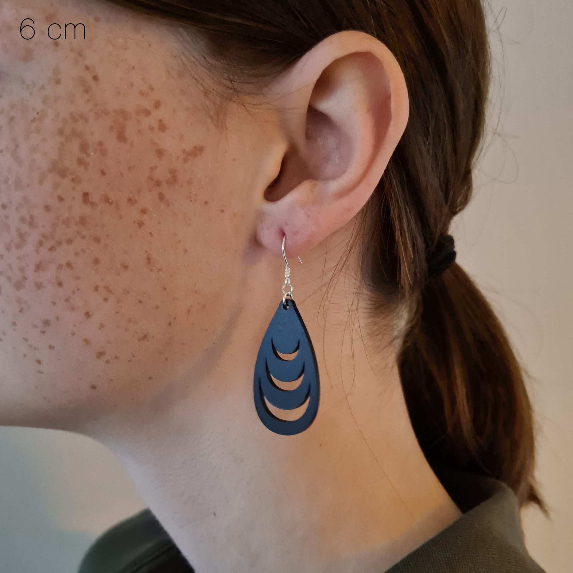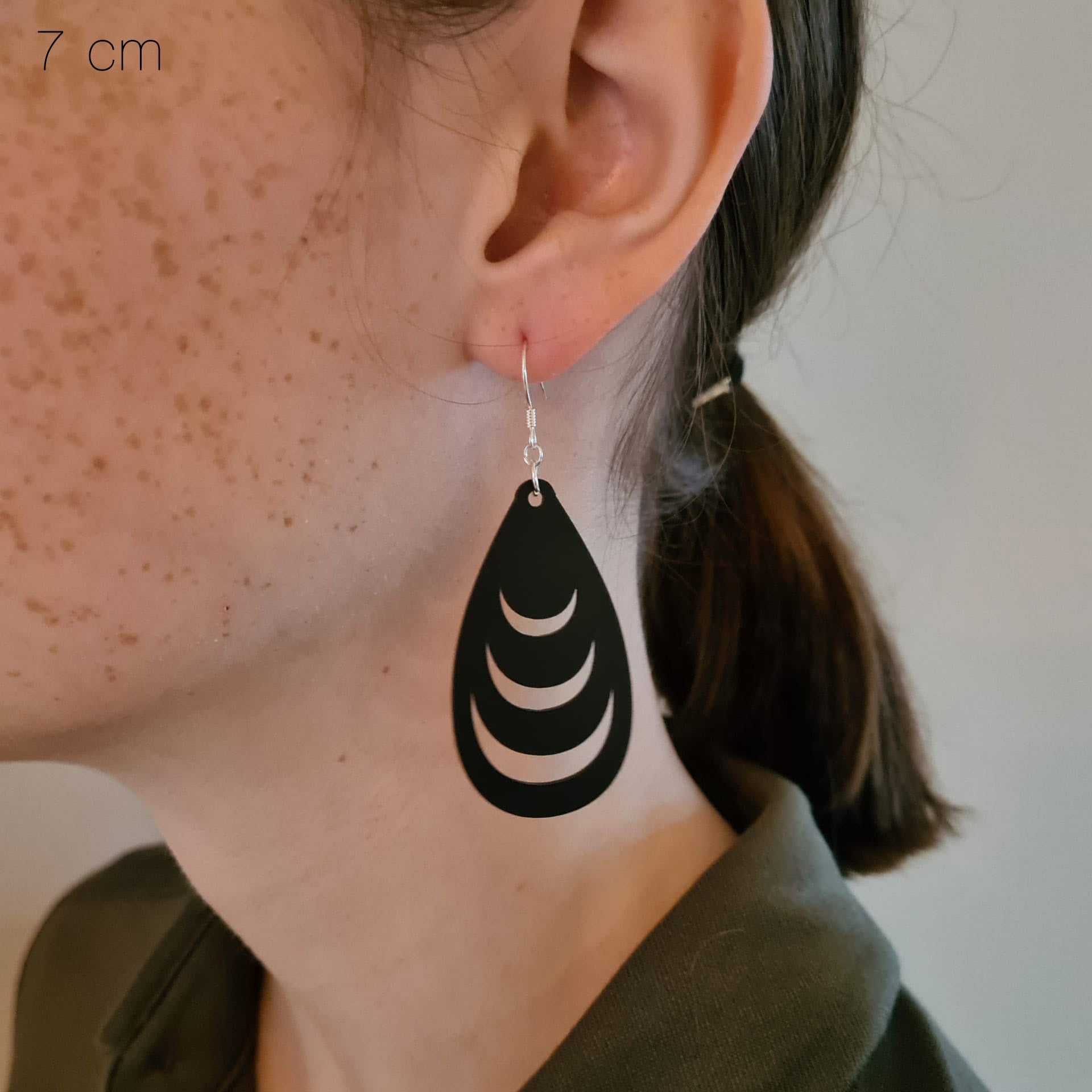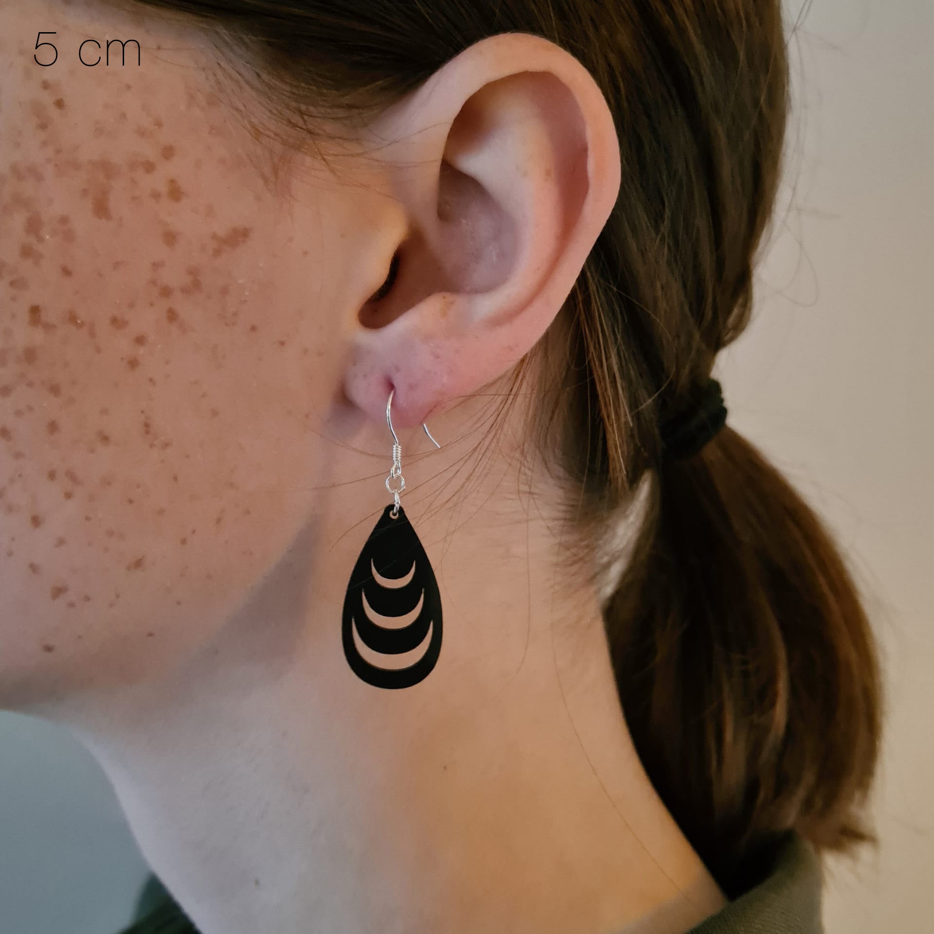 Deze zwarte oorbellen combineren de zachtheid van de druppelvorm met een uitgesproken gelaagd patroon. De brede, vloeiende lijnen creëren diepte en ritme, terwijl de diepe zwarte kleur zorgt voor een stijlvolle, moderne uitstraling.