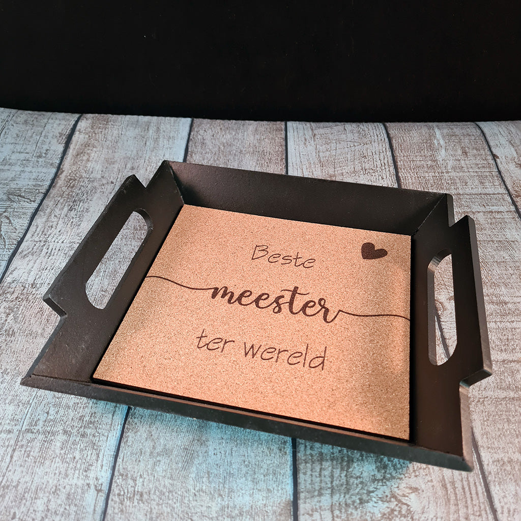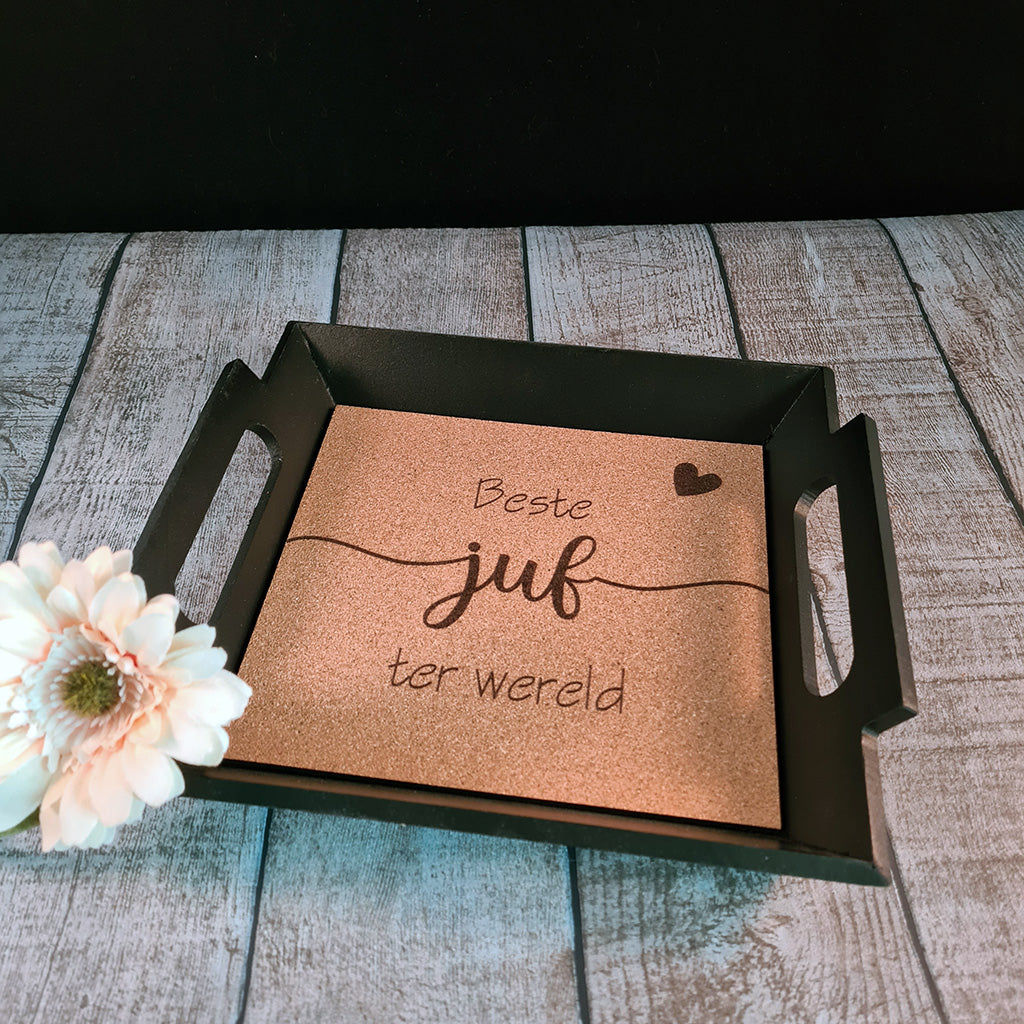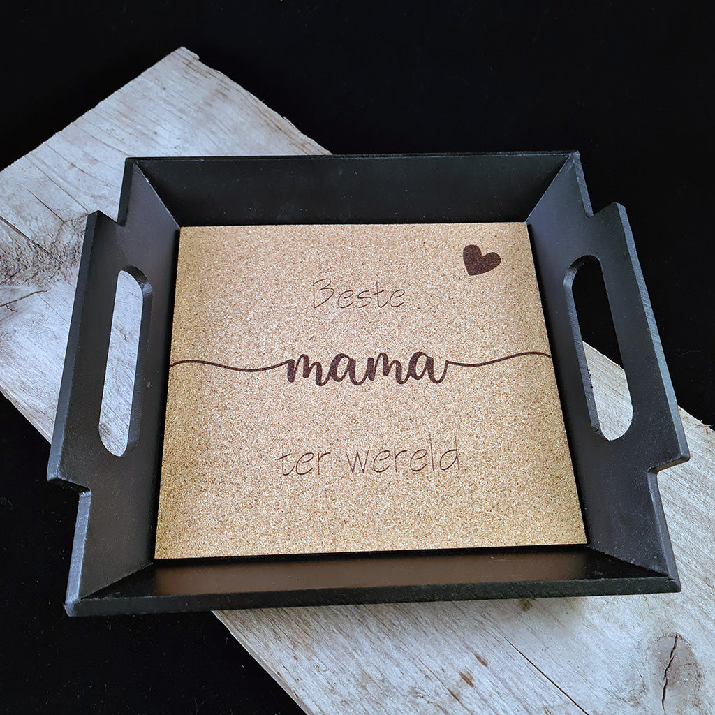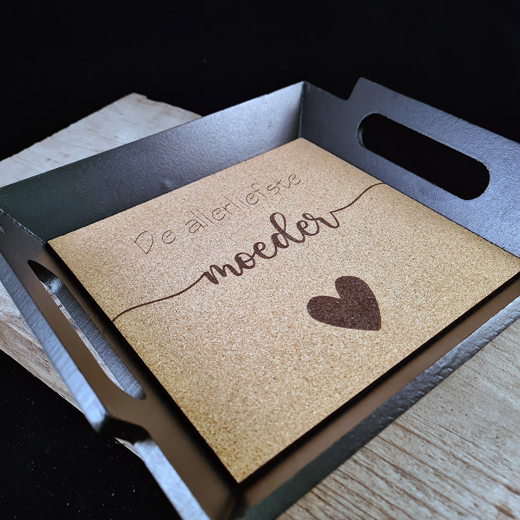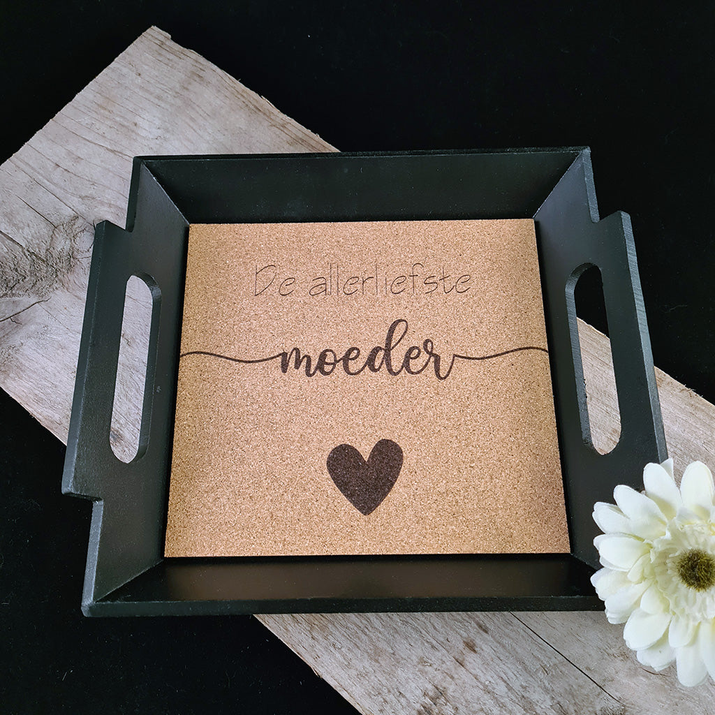Dienblad voor de liefste moeders, vaders, juffen of meesters. Het houten dienblad heeft een bodem in kurk waarop een mooie tekst is gegraveerd.
