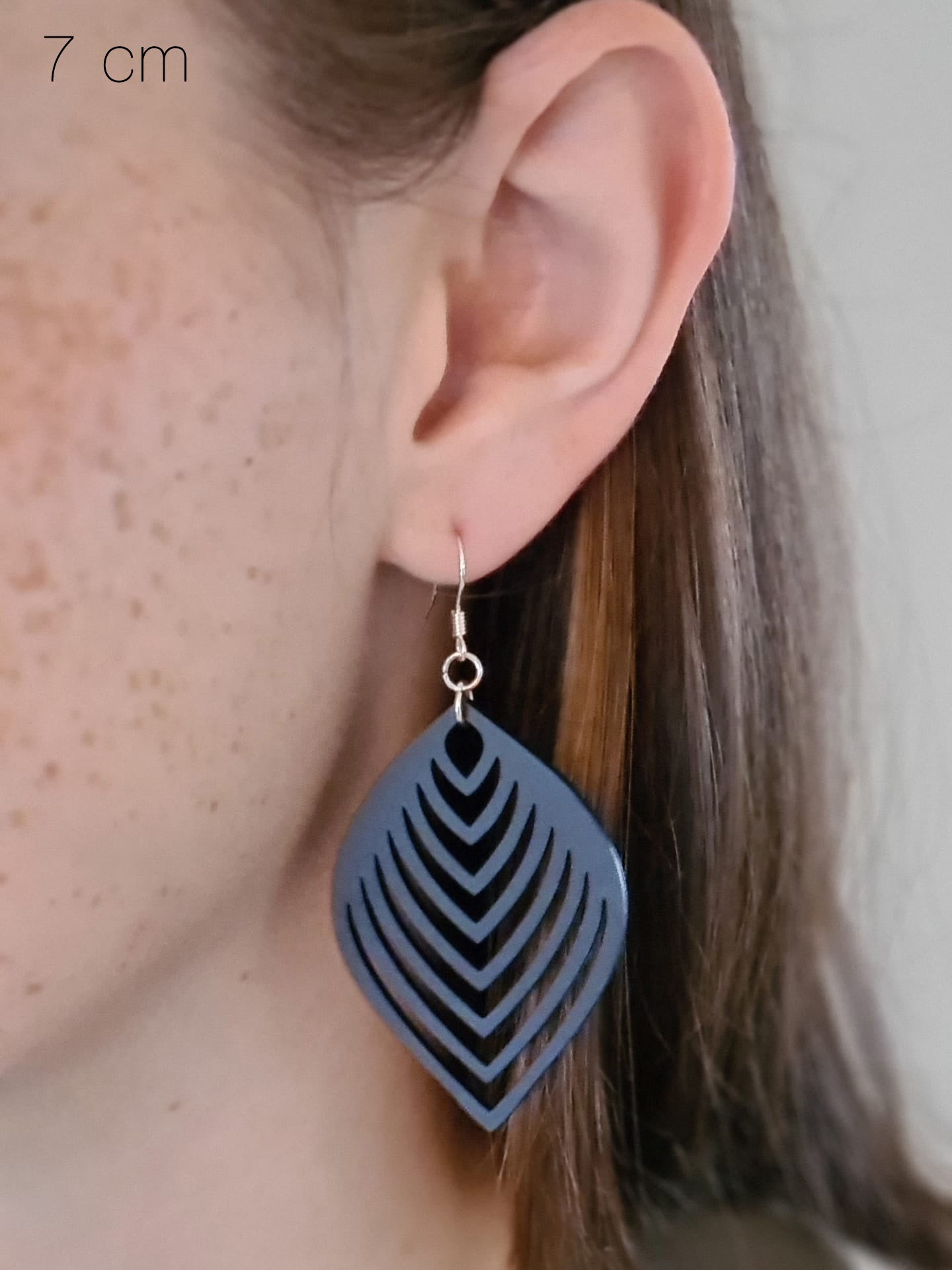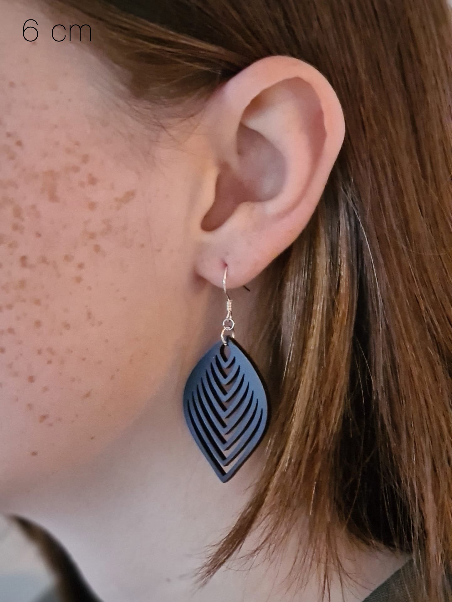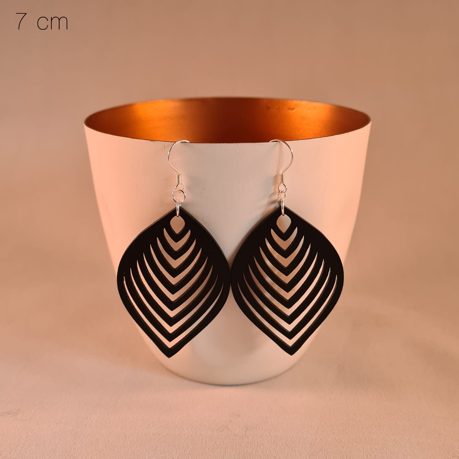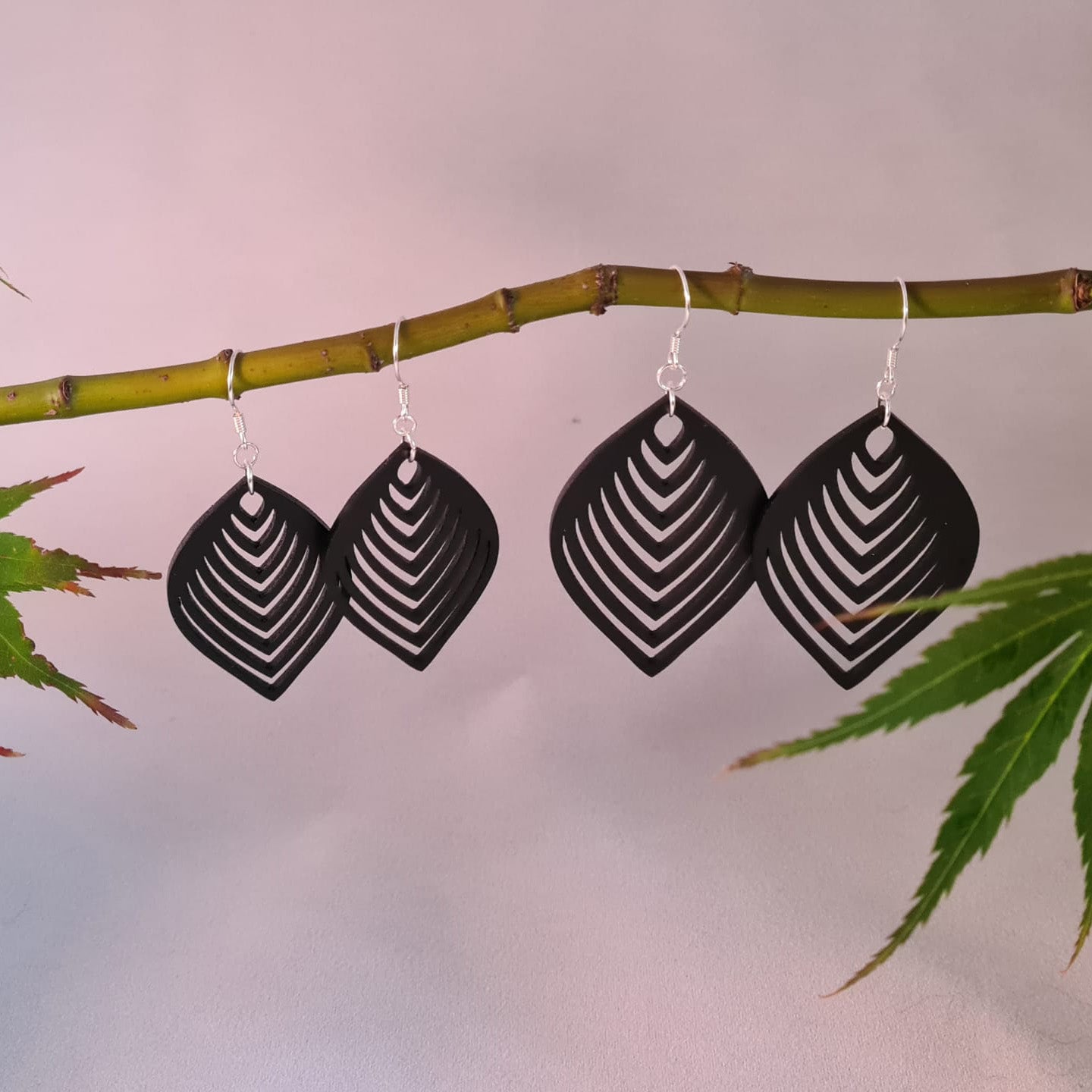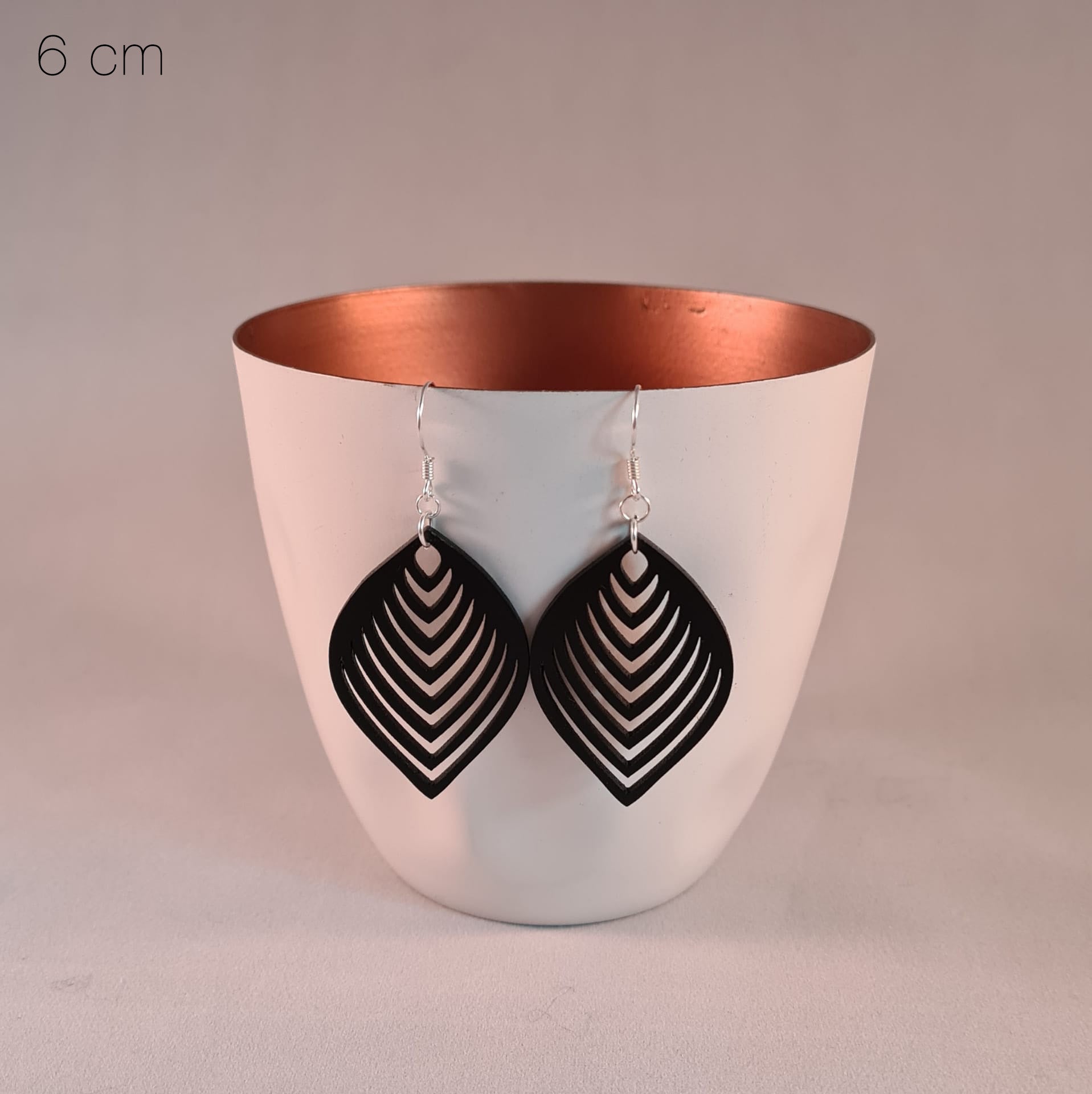 Deze zwarte oorbellen met abstracte blaadjesvorm zijn verfijnd uitgesneden in een elegant, gelaagd patroon dat doet denken aan de nerven van een blad. De zachte rondingen en grafische lijnen creëren een harmonieus evenwicht tussen natuur en design.