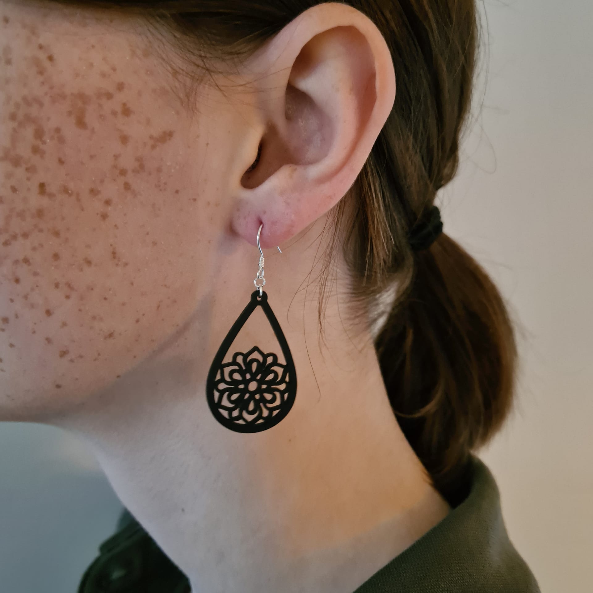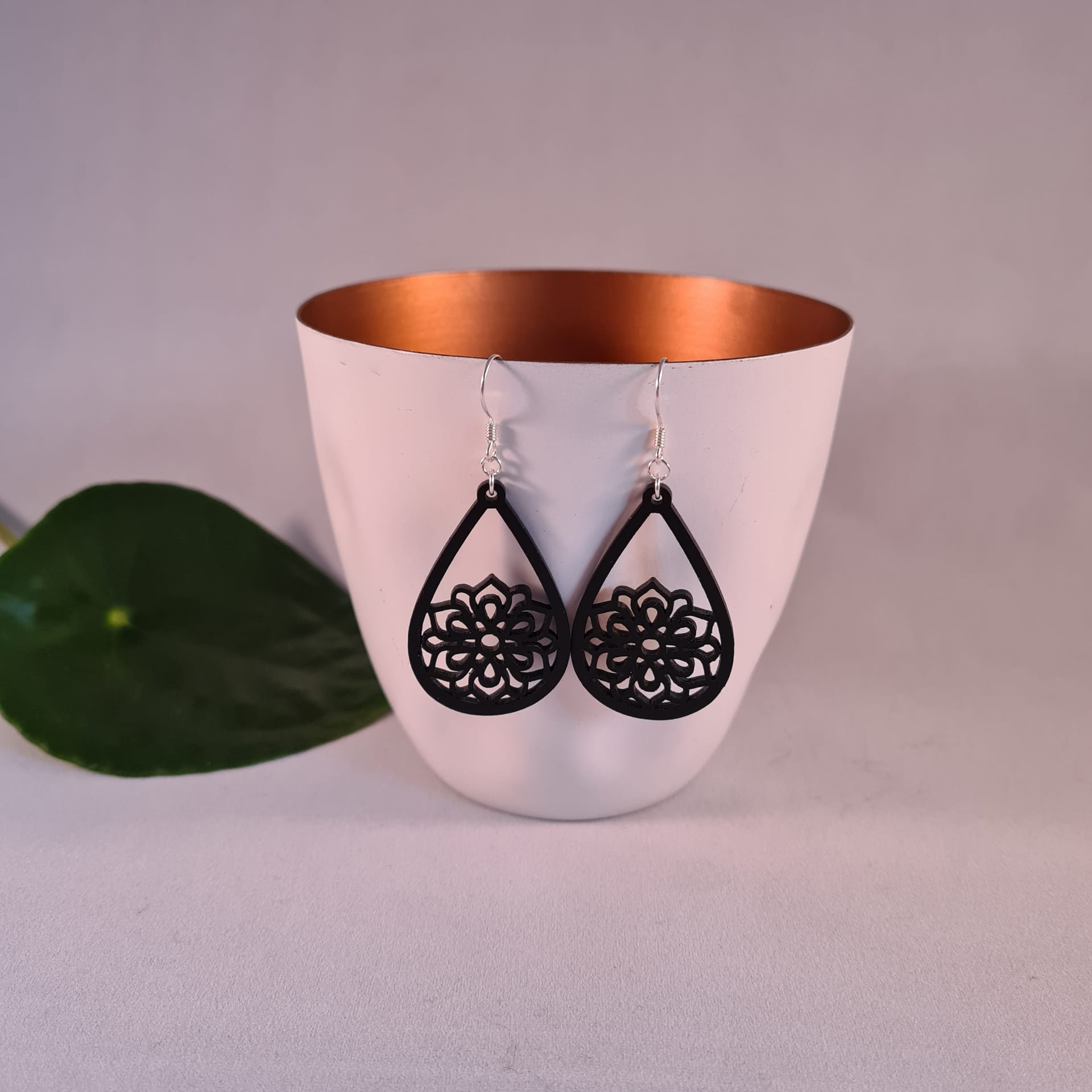 Deze zwarte oorbellen in druppelvorm met een verfijnd bloemenmotief stralen tijdloze elegantie uit. Het sierlijke patroon en de zachte rondingen brengen een harmonieus samenspel van kracht en zachtheid, perfect voor elke gelegenheid.