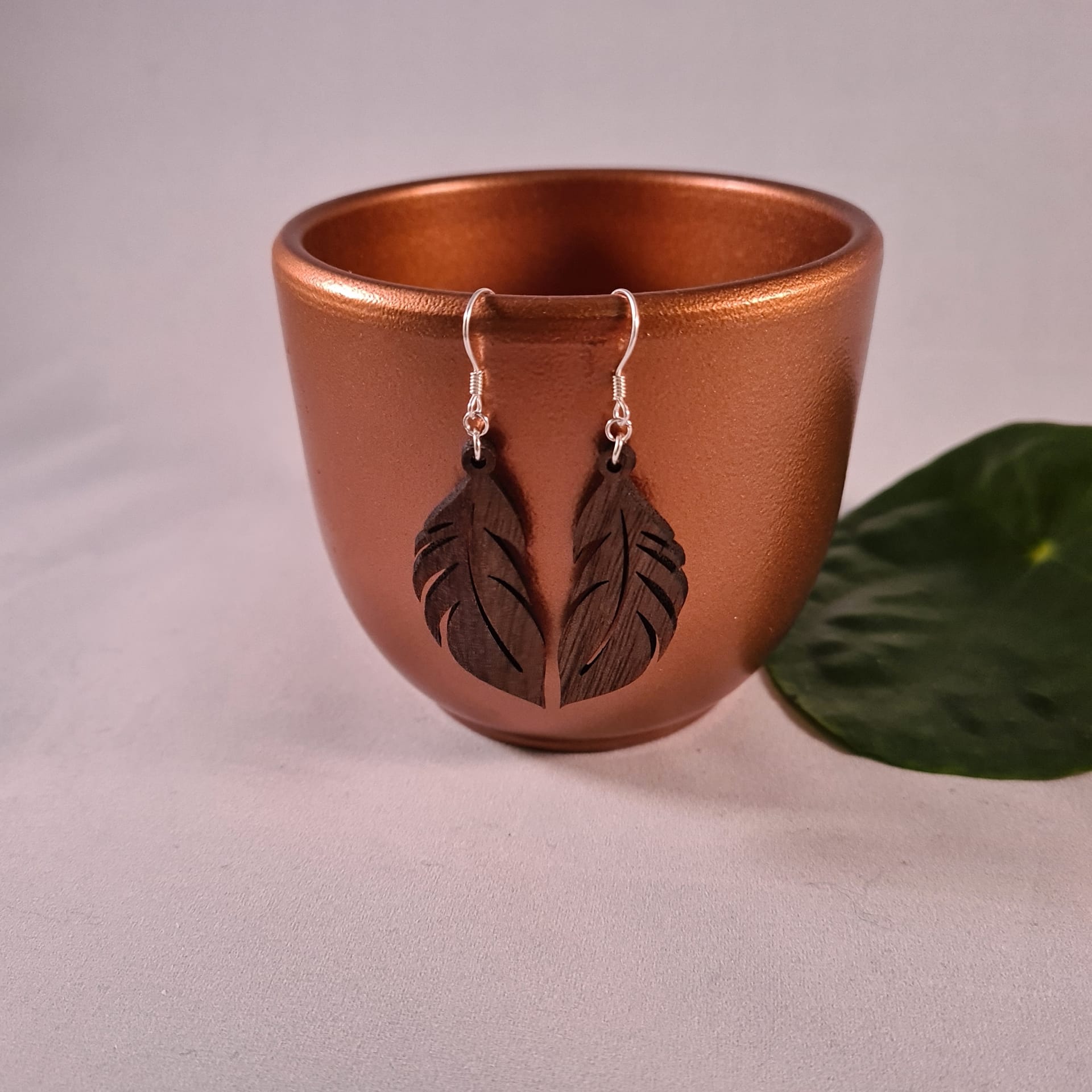 Sierlijke houten oorbellen in de vorm van veertjes. Licht, natuurlijk en elegant – een subtiele blikvanger met een zachte uitstraling.