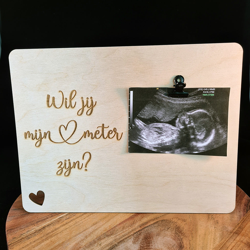 Een warm houten bord met plek voor jullie foto — een lieve, persoonlijke manier om te vragen: wil jij meter worden? Een moment vol emotie en hart.