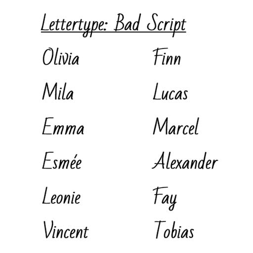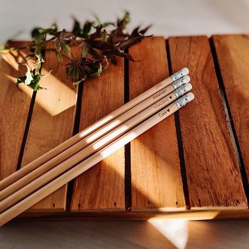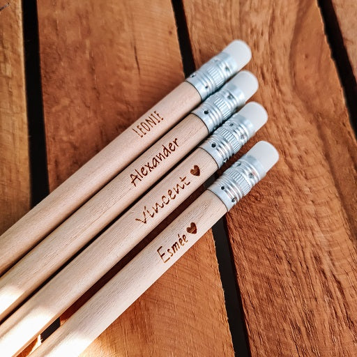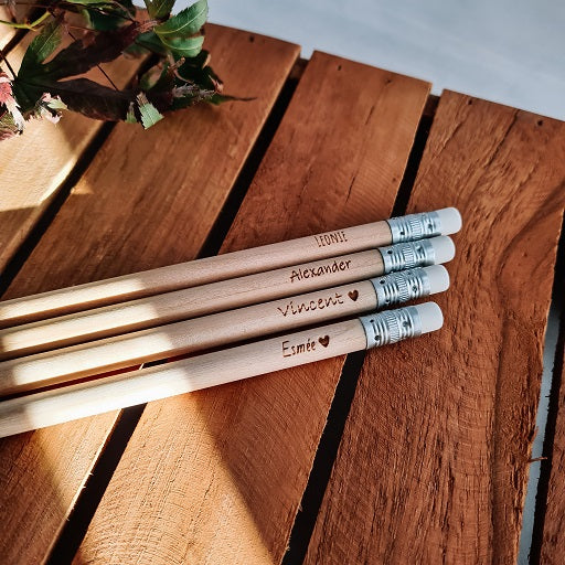 Deze potloden kunnen we personaliseren met je zelfgekozen tekst of naam. Je kan ook kleine figuurtjes laten toevoegen (zoals een hartje, sterretje,...). Als je meerdere potloden bestelt, mogen ze allemaal een andere tekst of naam hebben.
