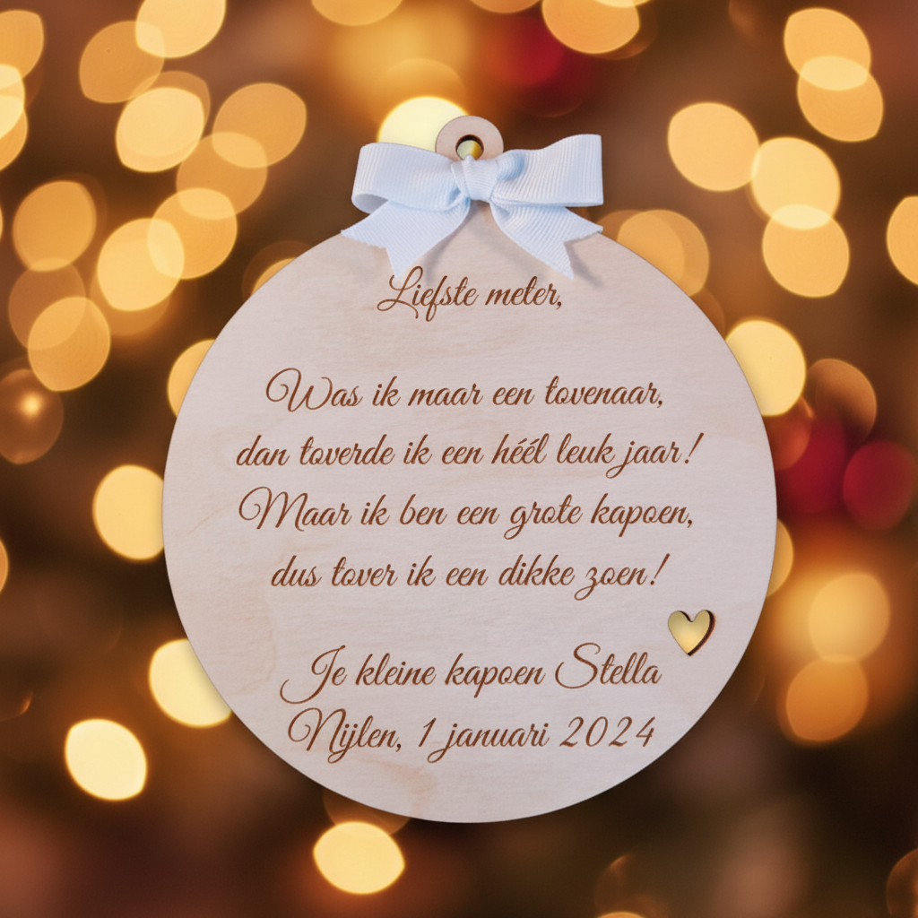 Laat je nieuwjaarswensen schitteren op hout. Onze houten nieuwjaarsbrieven zijn met liefde gegraveerd — een warm gebaar dat blijft en telkens opnieuw een glimlach brengt.