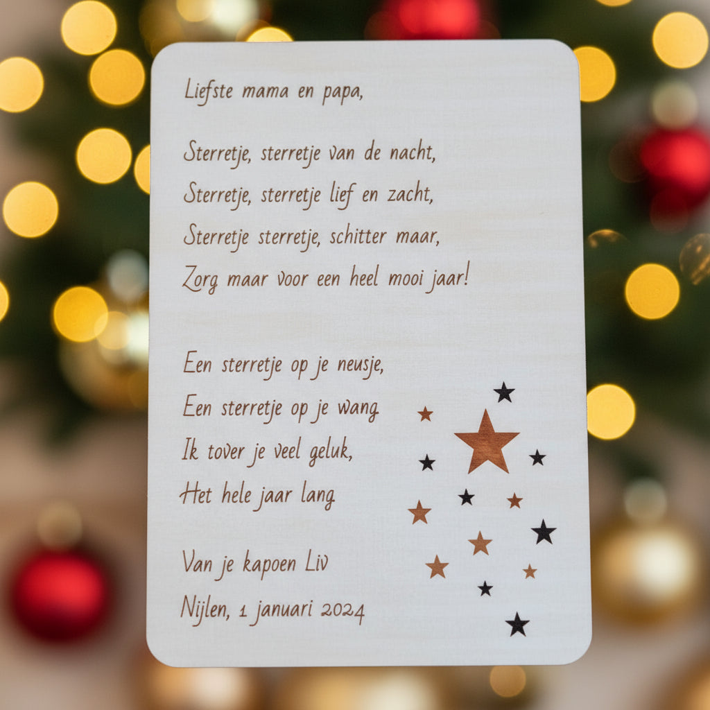 Vier het nieuwe jaar met woorden die blijven. Onze houten nieuwjaarsbrieven zijn kleine kunstwerkjes vol warmte en glimlach — een blijvend gebaar uit het hart.