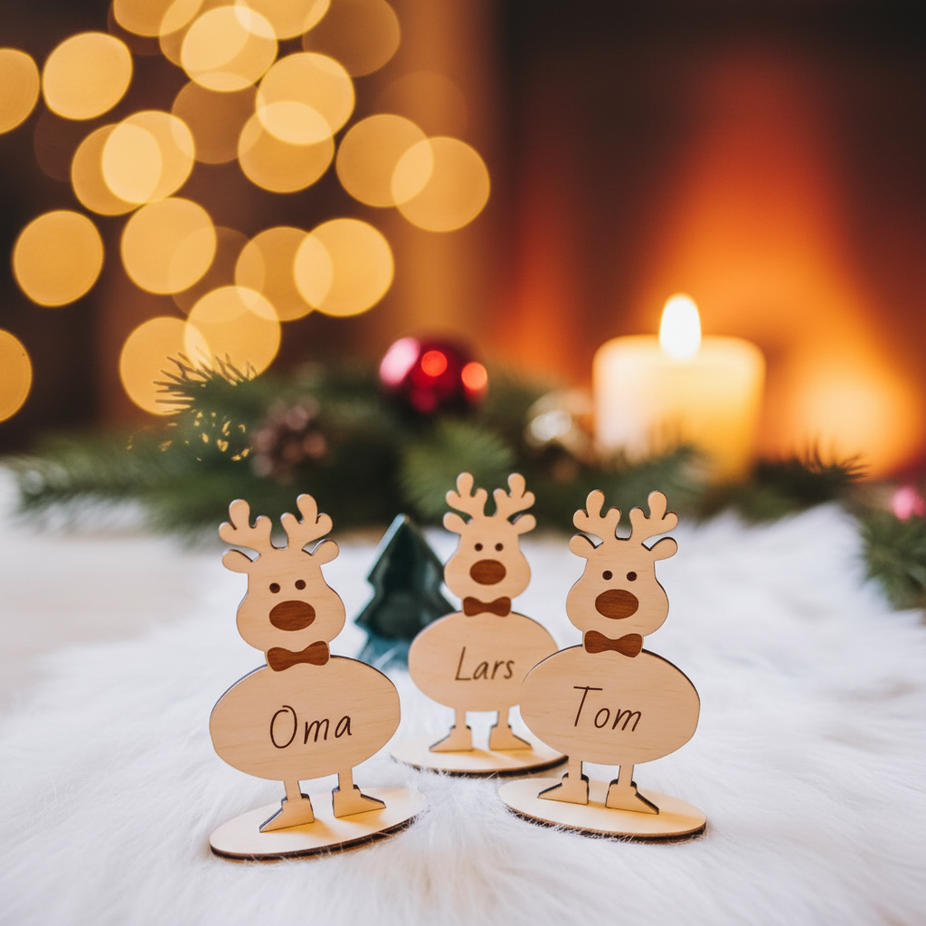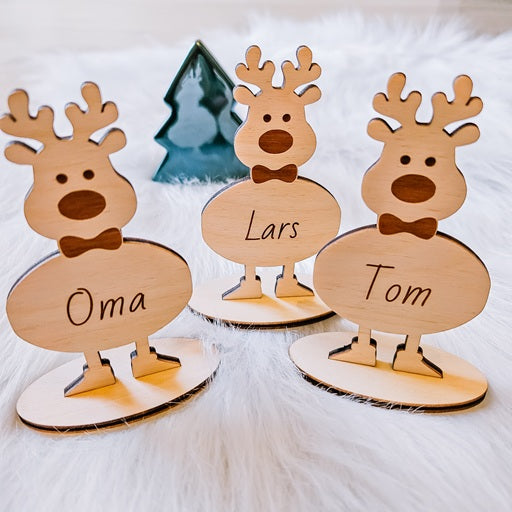 Breng extra warmte en gezelligheid aan je kersttafel met dit schattige, houten rendiertje. Elk rendiertje wordt gepersonaliseerd met een naam, waardoor het ideaal is om de plaatsen van je gasten aan te duiden tijdens het kerstdiner.