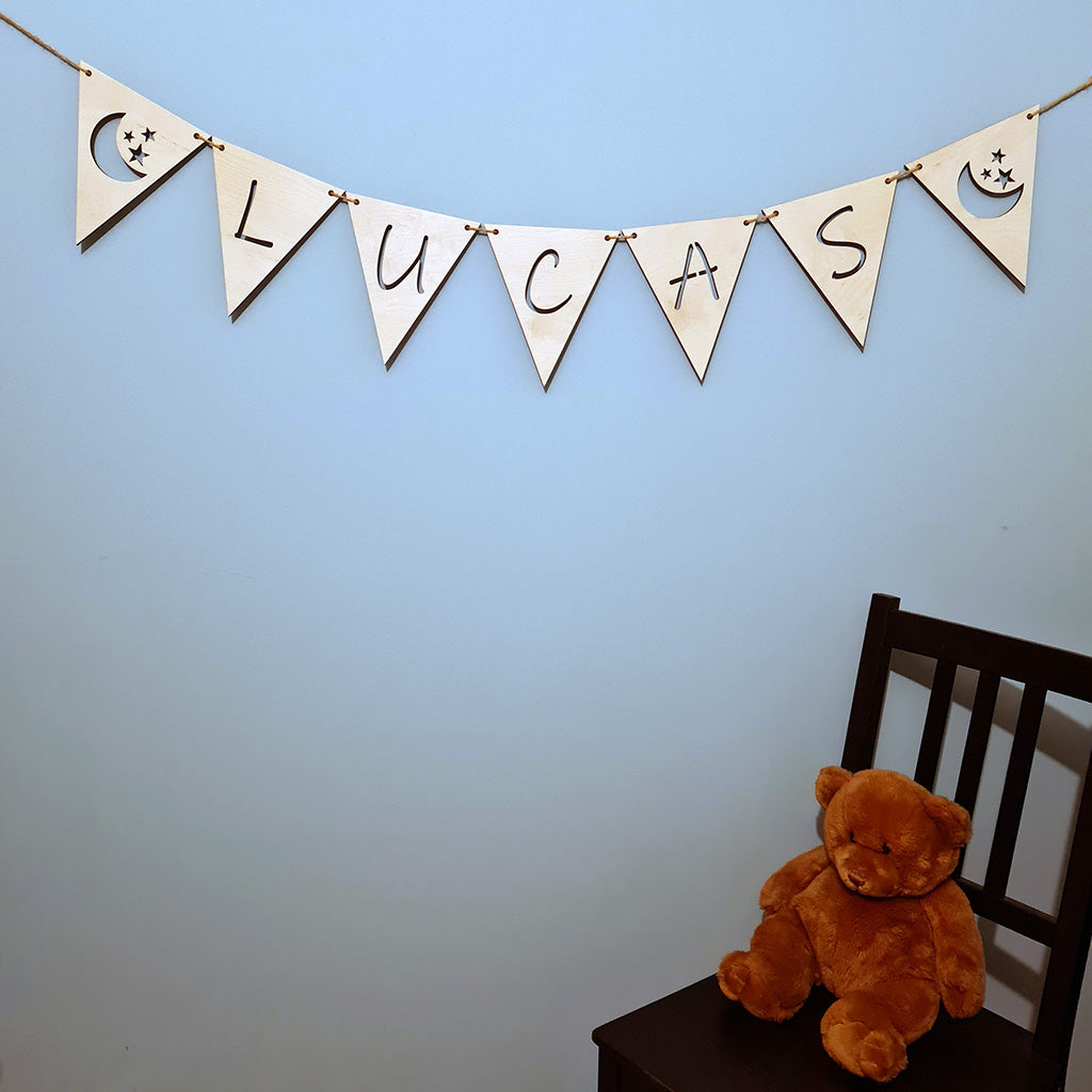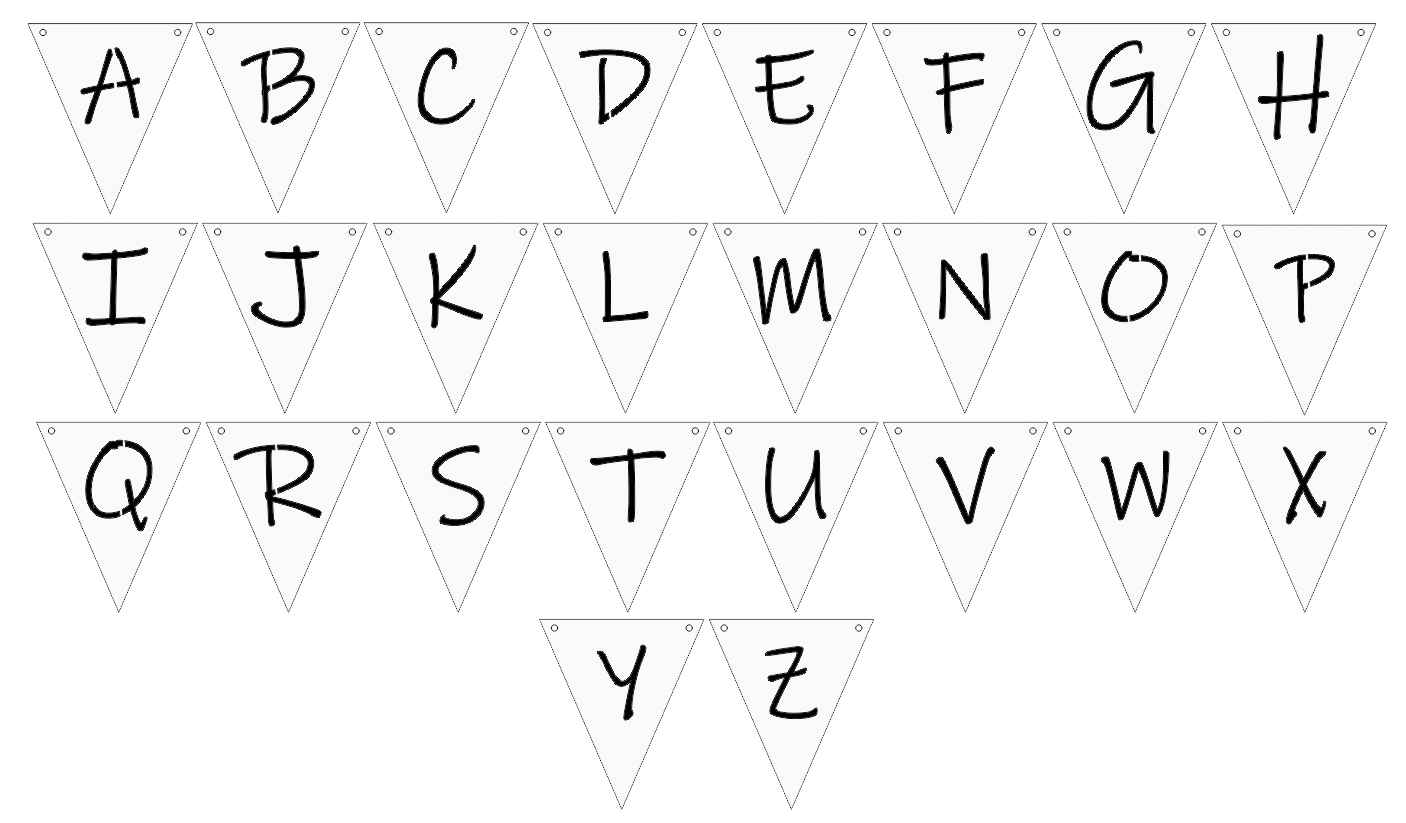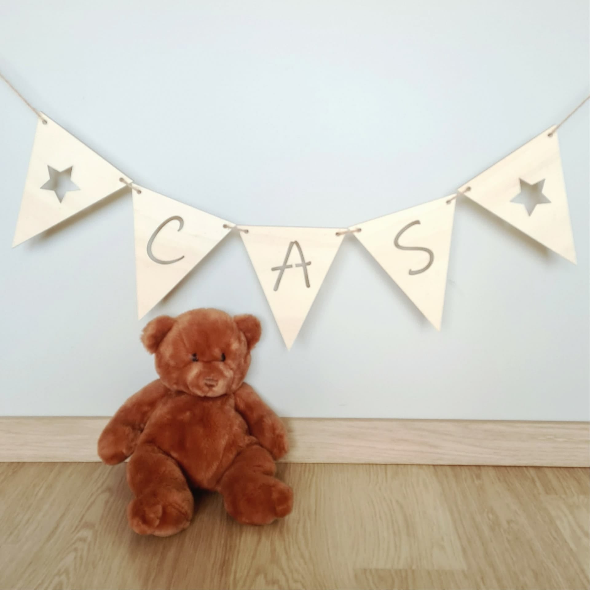 Maak een slinger met je eigen naam. Leuk voor in de kinderkamer of als decoratie. Je kan de vlagjes aan een sisal koord hangen, die wordt meegeleverd.