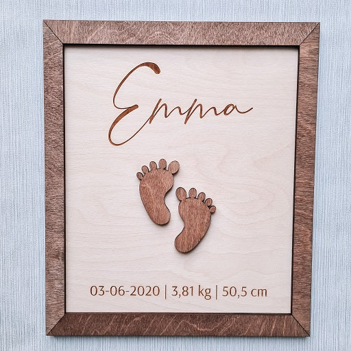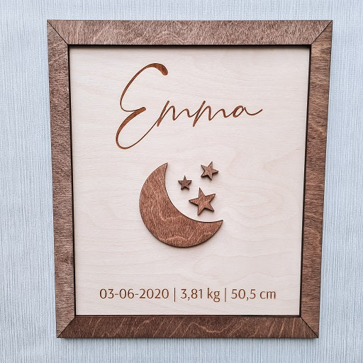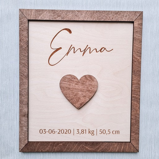 Dit houten naambord met donkere kader kan je gebruiken om de naam, geboortedatum, gewicht en lengte van je kindje te laten graveren. Uiteraard kan je ook enkel de naam erop laten zetten, het aantal gegevens kan je zelf kiezen.