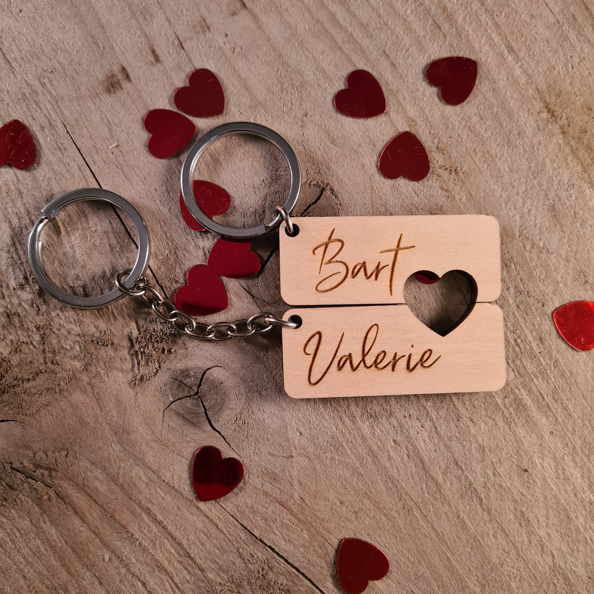 Set van twee houten sleutelhangers met de namen van jou en je geliefde. Zo passen jullie altijd samen ♥